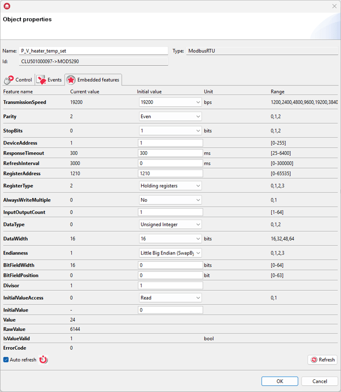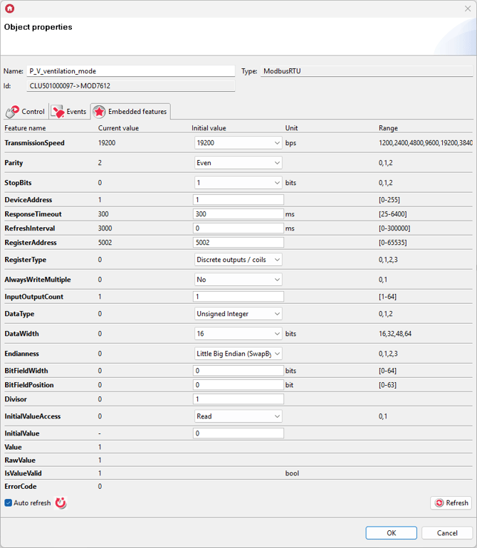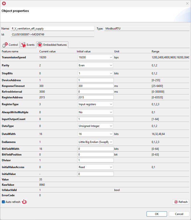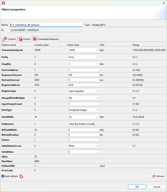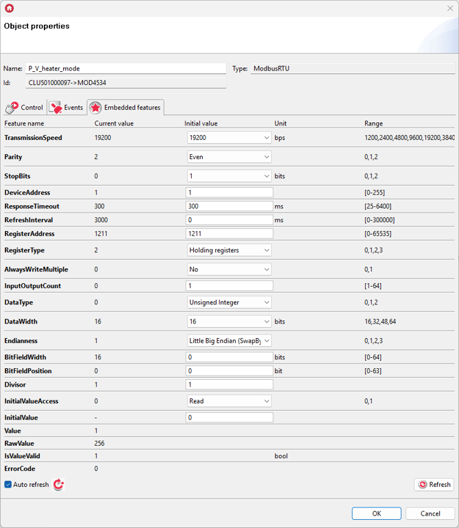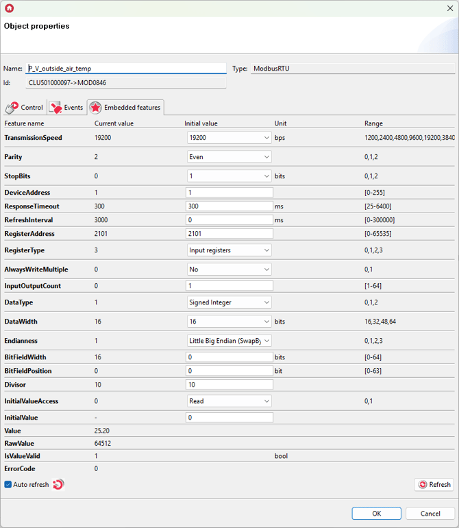 For these settings, enter the values of Embedded features in ModbusRTU virtual objects as follows: