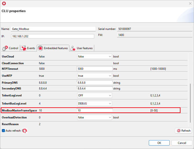 - Change to 10 the value of the ModbusMasterFrameSpace feature in the Gate Modbus module: