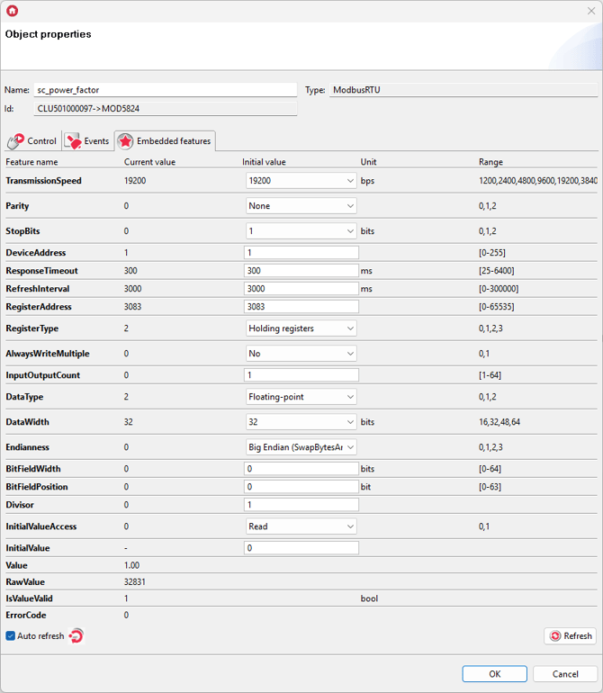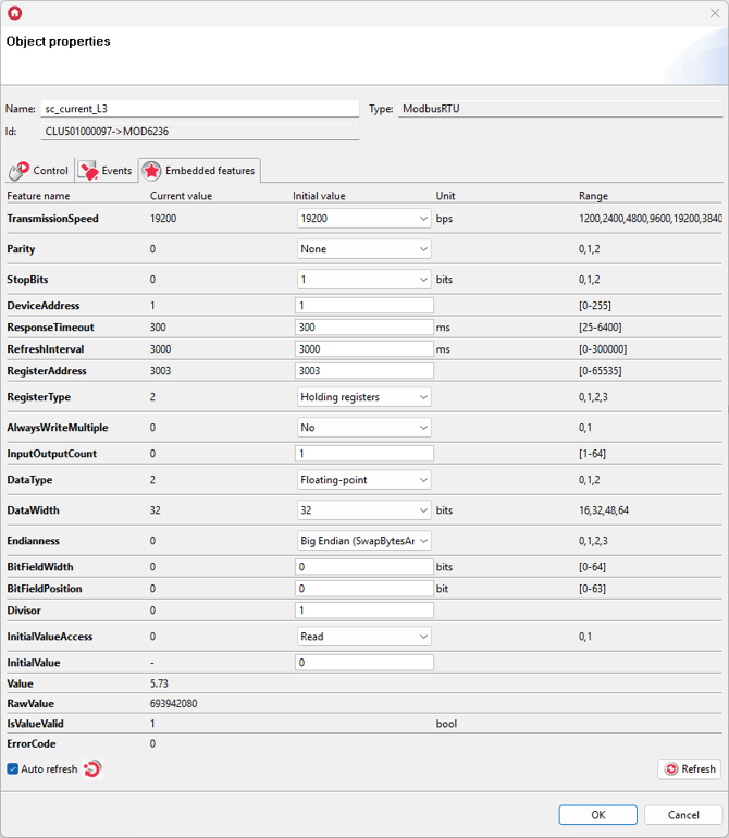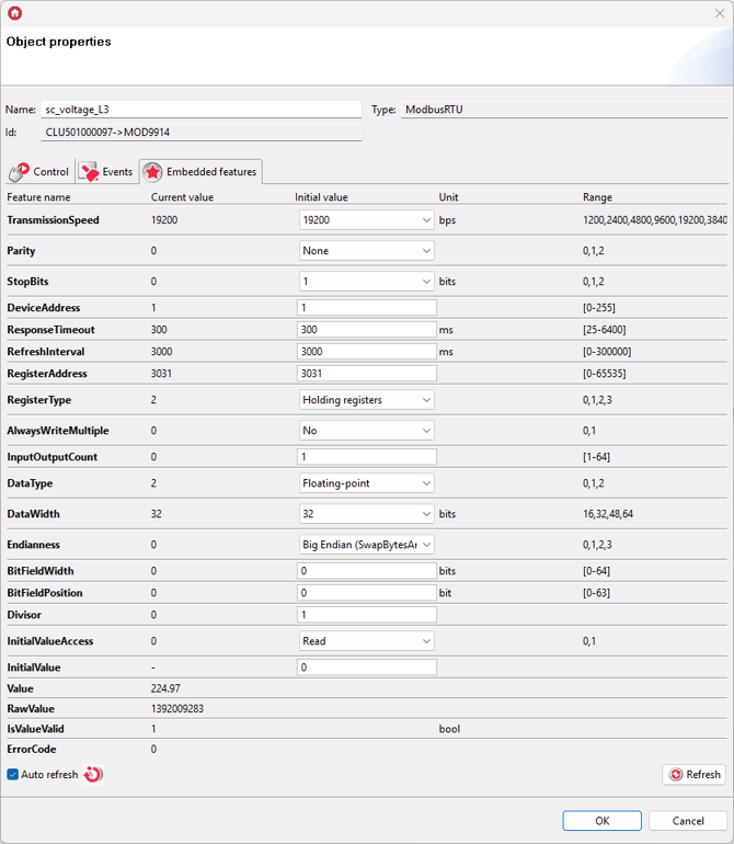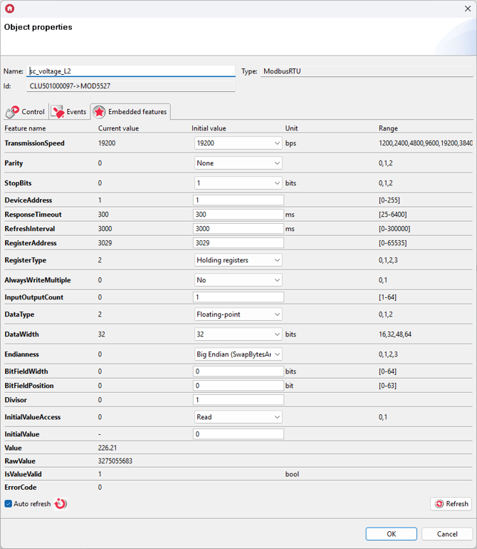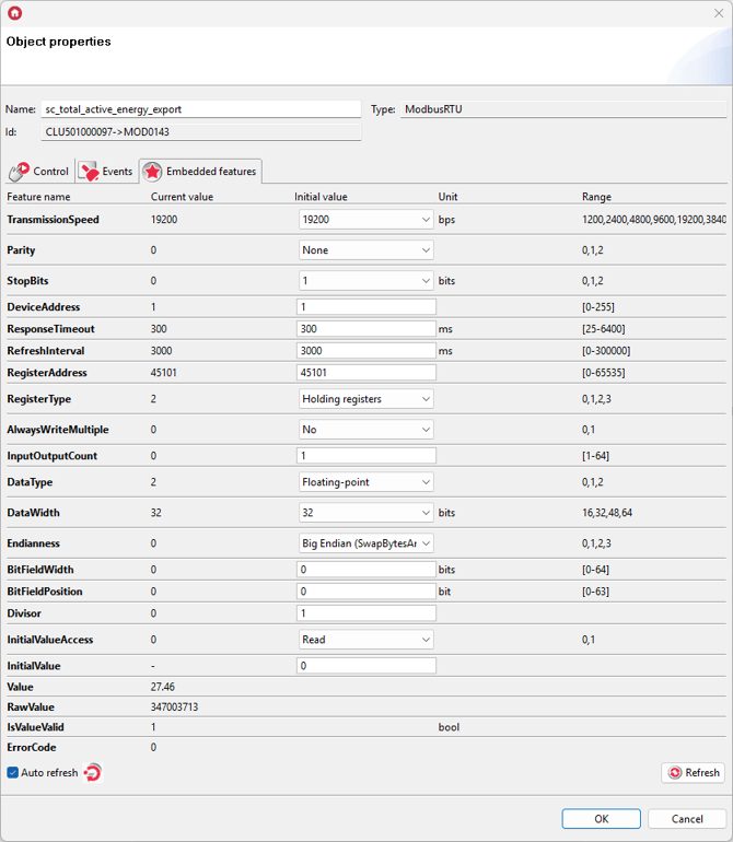 For these settings, enter the values of Embedded features in ModbusRTU virtual objects as follows: