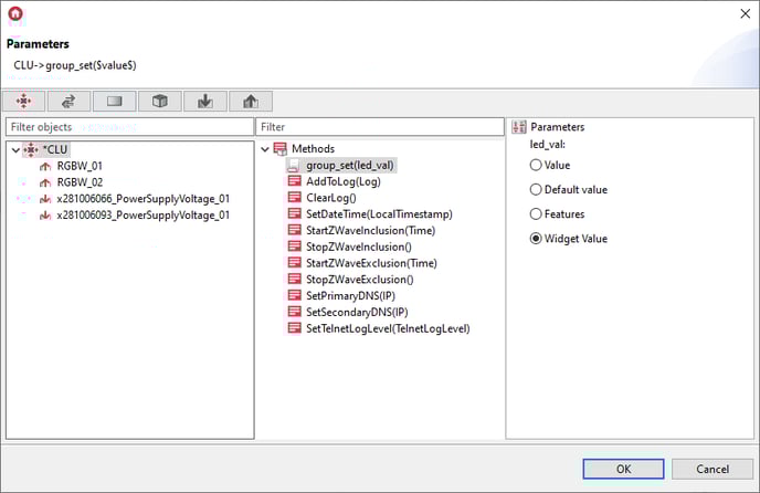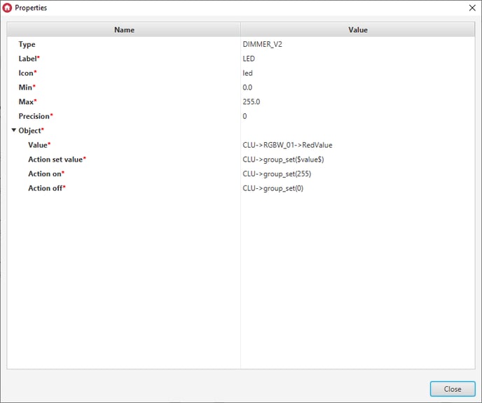 3. Add the Dimmer_v2 widget to the mobile interface and configure it as follows: