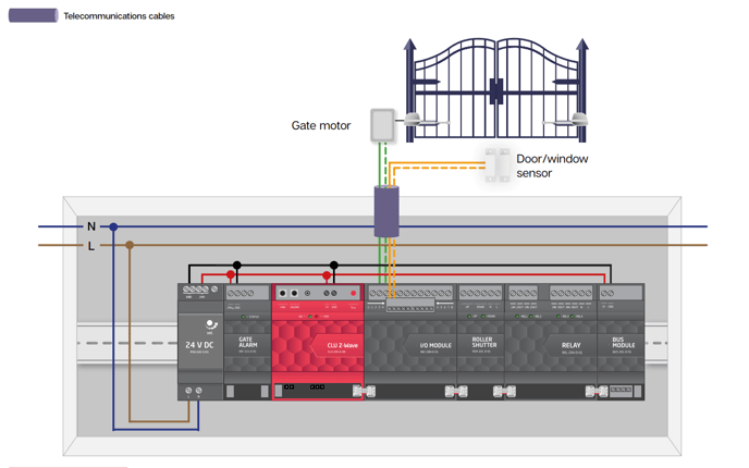 Controlling an entrance or garage gate is usually done by sending an impulse to the gate motor. In the Grenton system, such an impulse is executed via a relay output. Below is a connection diagram illustrating the wiring method: