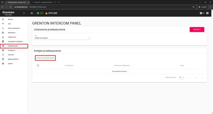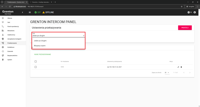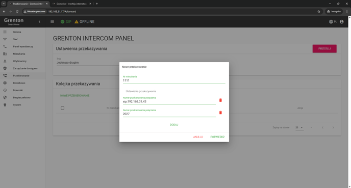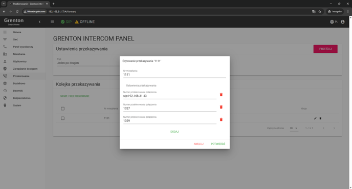 Numer przekierowaniapołączenia wprowadź dane:sip:adres_IP_monitora. W naszym przypadku jest tosip:192.168.31.43.