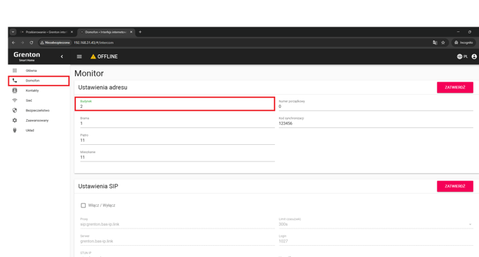 Monitor→Ustawienia adresuzmień wartość w poluBudynek.