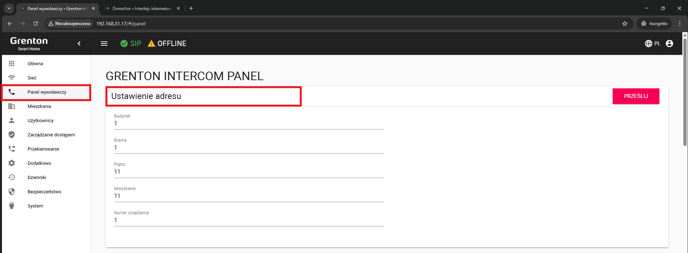 * Adres fizyczny domofonu możesz sprawdzić w zakładcePanel wywoławczy→Ustawianie adresu. Domyślnie przyjmuje wartości jak poniżej: