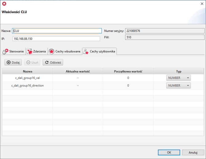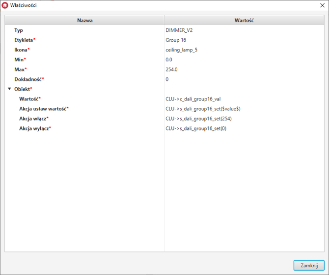 Konfigurację należy rozpocząć od przypisania obiektów DALI_GEAR do grup. W tym celu należy przejść do zakładki cechy wbudowane obiektu i w polu Group po przecinku wpisać numery wybranych grup (od 1 do 16).