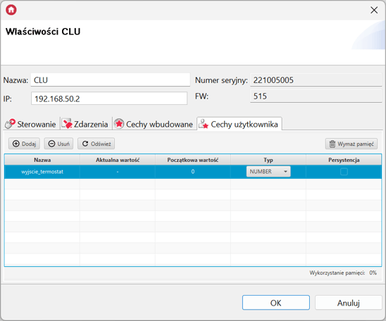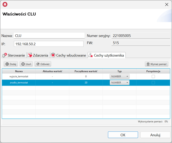 - *Jeżeli źródłem termostatu ma być temperatura mierzona przez głowicę, utwórz kolejną zmienną użytkownika typu