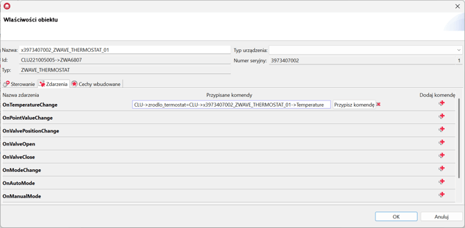 ZdarzeniaobiektuZWAVE_THERMOSTAT_01. Do zdarzeniaOnTemperatureChangeprzypisz przekazanie wartości z cechyTemperaturegłowicy do utworzonej wcześniej cechy użytkownika (source_thermostat):