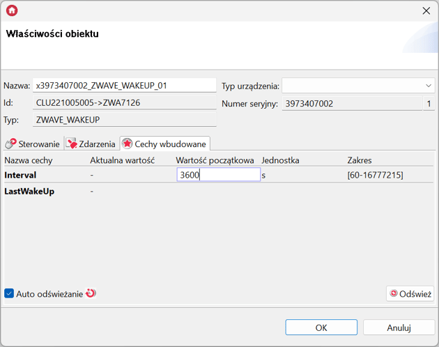 W takiej konfiguracji sam obiekt wirtualny Termostat powinien działać w trybie manualnym. Warto również dostosować parametr Interval w obiekcie ZWAVE_WAKEUP_01, który odpowiada za interwał wybudzania się modułu.