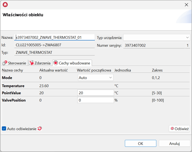 Rekomendowanym sposobem pracy głowicy jest tryb automatyczny. Aby upewnić się, że głowica pracuje w odpowiednim trybie, przejdź do Cech wbudowanych obiektu ZWAVE_THERMOSTAT_01 i zweryfikuj, czy cecha Mode jest równa Auto.